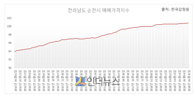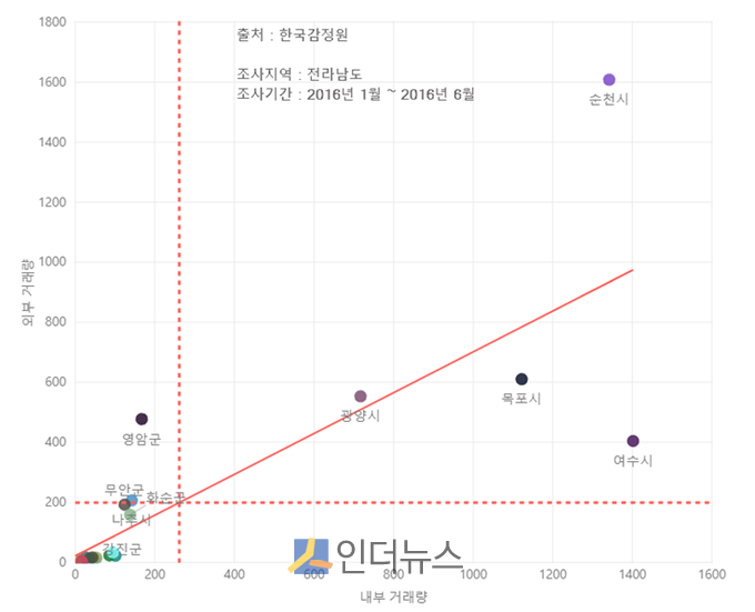 전라남도 차트를 살펴보자. 매입자 거주지별 현황을 시군구 기준으로 외부·내부로 나눠 거래량 합계로 나타냈다. 전라남도 순천시의 경우 2016년 1월부터 2016년 6월까지 내부거래량 대비 가장 높은 외부거래량을 보여주고 있으며 매매가격지수의 상승이 눈에 띄게 높아지고 있다.