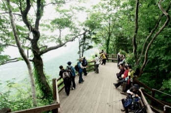 성인봉까지 오르는 길, 사람들이 바다를 내다보며 휴식을 취하고 있다.
