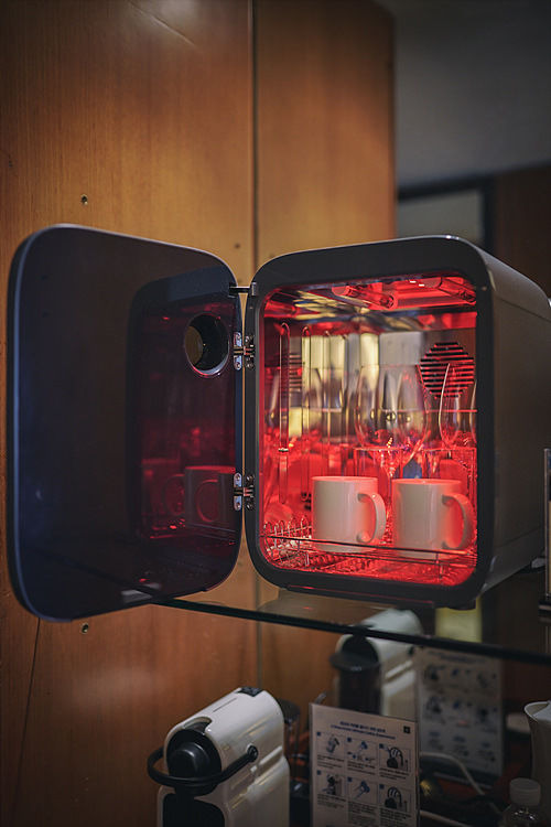 객실 내 살균기가 있어 컵을 더욱 깨끗하게 쓸 수 있다. 아이를 위한 용품도 살균기에 건조할 수 있으니 가족 단위 여행객에게 일석이조.