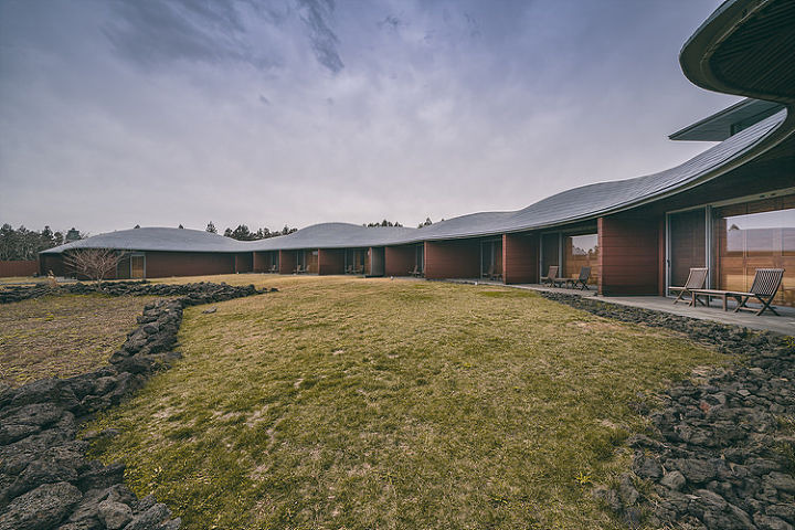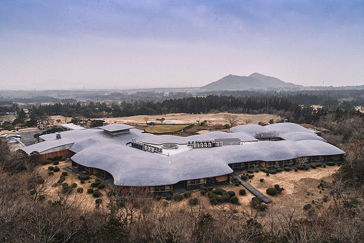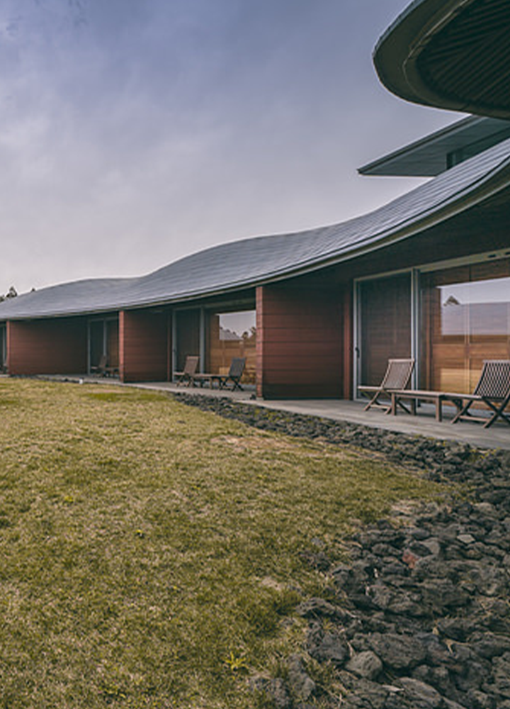 산의 능선을 따라 굽이굽이 곡선을 이루고 있는 지붕은 위에서 봤을 때 알알이 달린 포도송이 같다고 해 포도호텔이라는 이름이 붙었다. 기존 호텔과 다른 단층 구조가 가장 큰 특징으로 높이가 주는 위압감이 없기에 어쩐지 더 친근하고 아늑한 느낌이 든다.