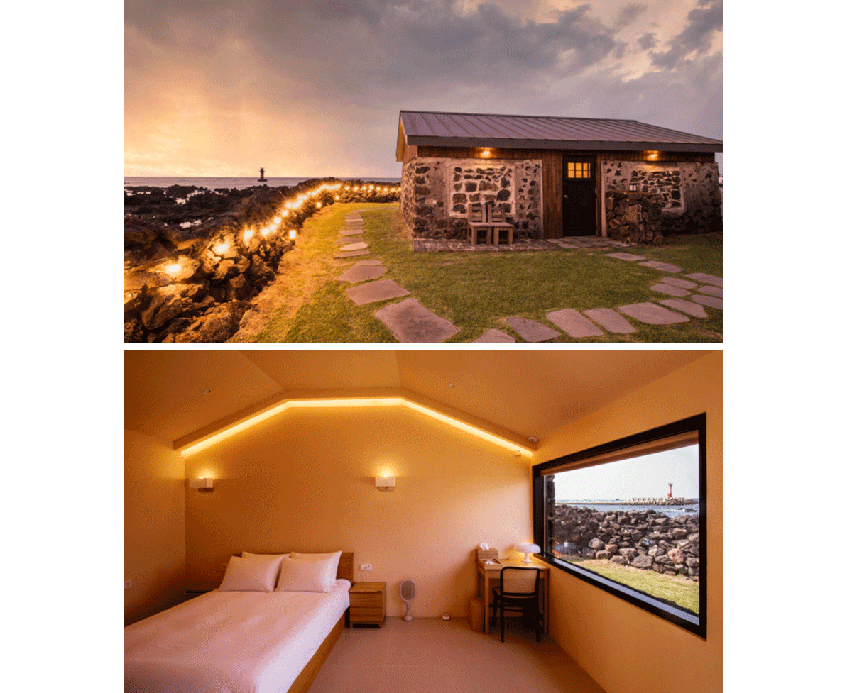 제주 동쪽 조천 마을 깊은 곳에 위치한 ‘하루 앤 하루’는 높은 천장의 개방감과 제주 특유의 현무암이 더해진 공간이다. 잔잔한 파도가 특징인 ‘만’ 형태의 파다를 품고 있어 제주의 어느 숙소보다 고요한 힐링을 즐길 수 있는 곳. 제주 바다를 품은 오션 뷰 테라스부터 바비큐를 즐길 수 있는 잔디 마당까지, 단순히 여행을 위한 공간 이상의 재미와 가치를 지녔다. 돌집과 옥상 정원집 두 가지 형태의 독채로 구성되어 예약 시 운이 좋다면 취향에 따라 자유롭게 선택 가능하다.