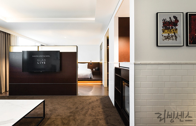 프라이빗 스몰 파티가 가능한 호텔. 6인용 코너 소파와 50인치 TV를 앞에 두고 있으니, 친구 집에 온 듯 편안한 느낌마저 든다. 글래드 하우스는 침실과 소파 공간을 반으로 나눠 취향대로 이용할 수 있게 했다. 벽면에 헨릭 빕스코브의 작품을 전시해 아티스틱한 느낌을 살렸다. 강렬한 파스텔 톤의 색감이 특히 아름다운 ‘디 브릿지’를 함께 이용할 수 있는 연말 패키지도 판매하고 있다.