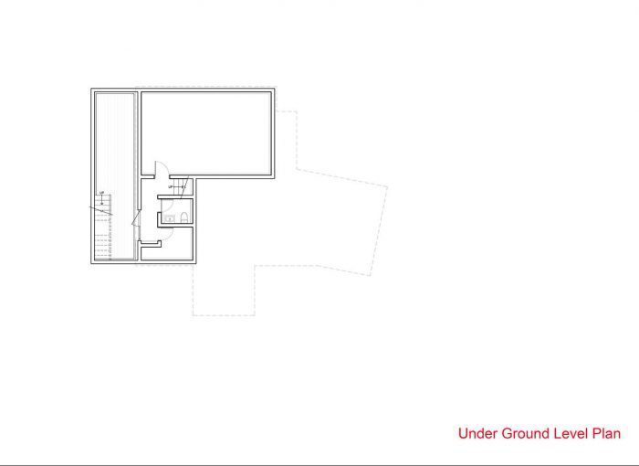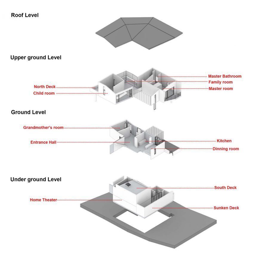 Our strategy was placing the home theater parallel and below the road. Other spaces embrace it at various distances. Windowless wall of the home theater keeps the house private from the road. Since it is semi underground space, a sunken deck was adjoined for ventilation and natural light.