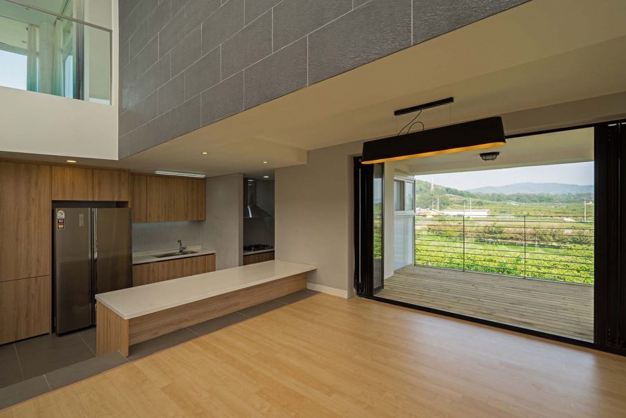홈씨어터 북쪽으로는 주차장과 현관이 위치한다. 현관에 들어서면 공간이 세 갈래로 나뉜다. 현관 왼쪽 가장 가까운 곳에는 할머니 방이 있다. 사생활을 보호하면서 출입이 용이하도록 만들었다. 오른쪽에는 2층으로 곧장 올라갈 수 있는 계단이 있으며, 정면으로는 주방과 식당이 자리한 매개 공간이 있다. 반지하에 있는 홈씨어터와 2층 안방을 잇는 중간 지점인데, 지하로 내려가는 계단부터 2층 높이까지 층고가 개방되어 있다. 주방과 식당 사이에는 3단의 높이차가 있으며 식당에서는 동쪽으로 난 창을 통해 배밭의 절경을 감상할 수 있다.
