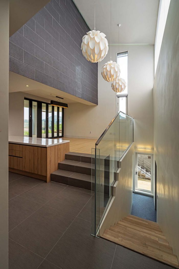 From the narrow entrance hall, the space between upper level master zone and lower level home theater is dramatically exposed to high ceiling and dark mass of Master zone is floating over dining space, where is open to pear orchard view. The child’s room on upper level has high ceiling with attic space, where is his secret playground. Open gate guide to family room. It is open to mountain views to the north and east side while overlooking in between space. Narrow corridor leads to open master bathroom and master bedroom.