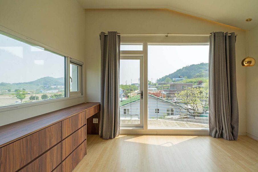 2층으로 올라가면 오른편에 아이방이 있다. 아이의 선호를 반영해 사다리와 다락공간을 만들었고, 남측 내벽 상부를 통유리로 마감해 다락 공간의 채광을 극대화했다. 아이방 건너편은 홈씨어터의 상부로 외부 데크가 마련되어 BBQ 장소로 활용이 가능하다.
