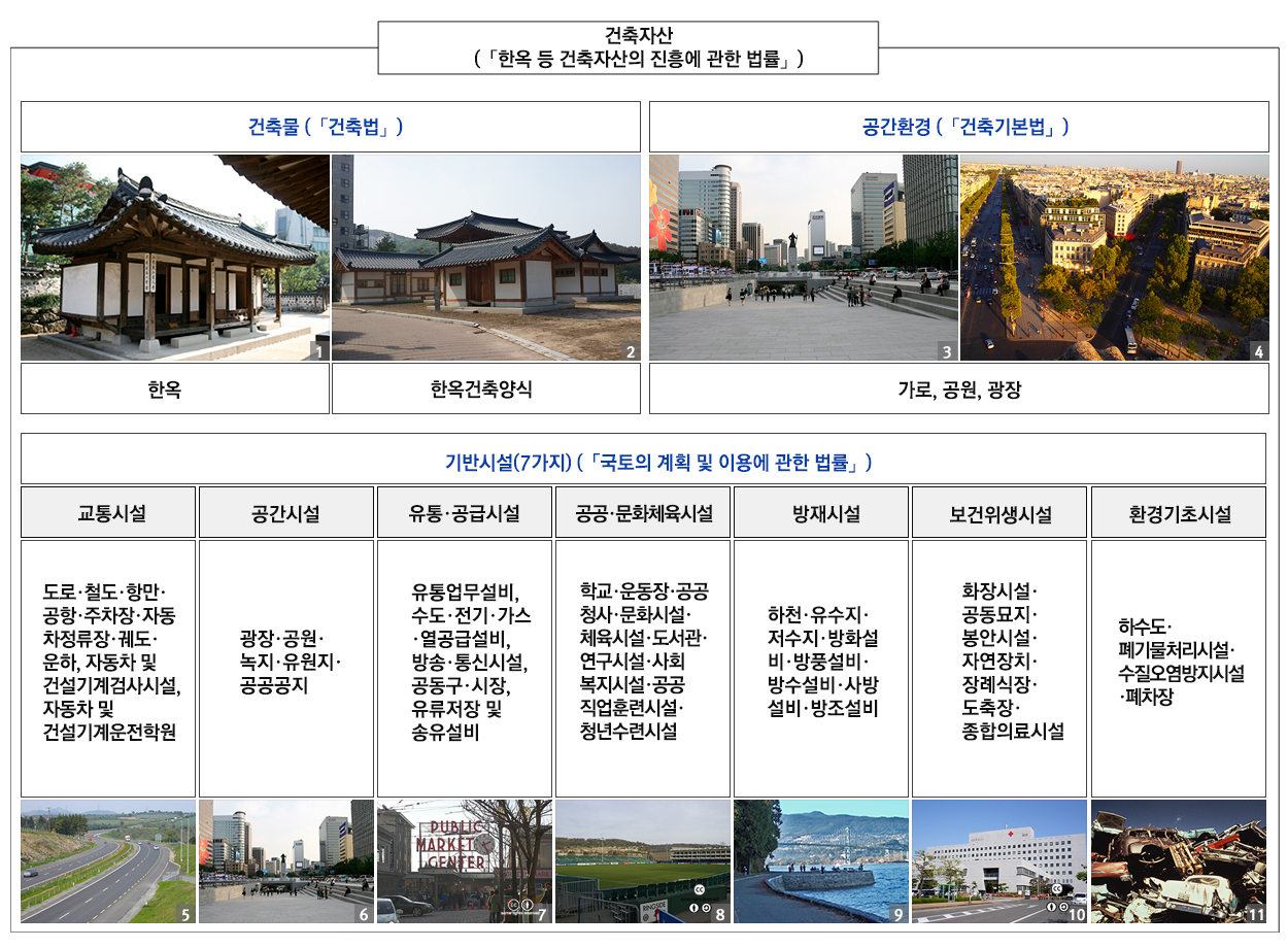- ‘건축자산’이란 현재와 미래에 유효한 사회적·경제적·경관적 가치를 지닌 것으로서 한옥 등 고유의 역사적·문화적 가치를 지니거나 국가의 건축문화 진흥 및 지역의 정체성 형성에 기여하고 있는 ①「건축법」 제2조 제1항 제2호에 따른 건축물, ②「건축기본법」 제3조 제2호에 따른 공간환경, ③「국토의 계획 및 이용에 관한 법률」 제2조 제6호의 기반시설, 중 어느 하나에 해당하는 것을 말한다. 다만 「문화재보호법」에 따라 지정·등록된 문화재는 제외한다. <「한옥 등 건축자산의 진흥에 관한 법률」 제2조>