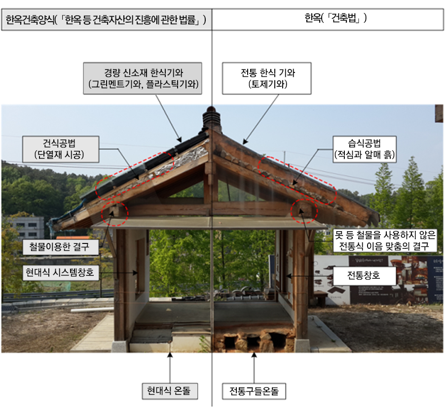 ‘한옥등건축자산법’에서는 건축자산1)으로서 ‘한옥’과 ‘한옥건축양식’을 구분한다. 한옥은 「건축법」 정의와 유사하게 규정하고 있고, 한옥건축양식은 현대적인 재료와 기술을 사용하는 것을 수용하고 있어 흔히 사회에서 ‘신한옥2)’이라 부르는 것까지를 포함하고 있다.