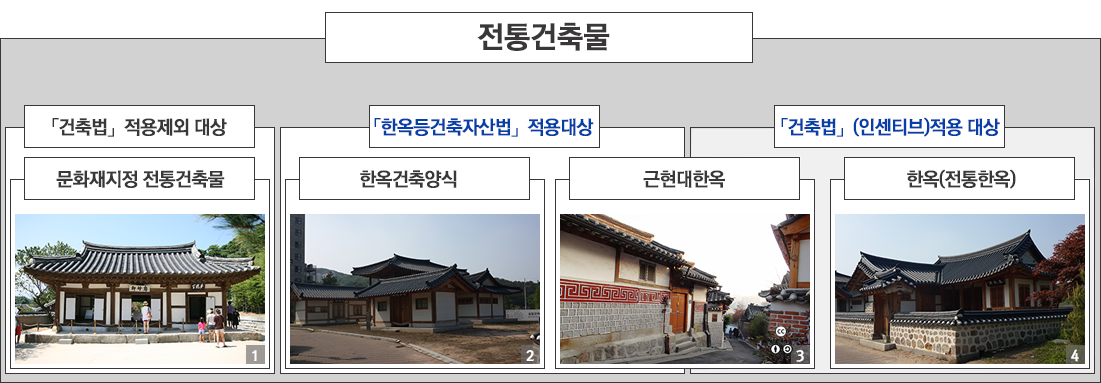 한옥건축물을 포괄적으로 정의한다는 것은 어려운 작업이지만, 현대에 존재하는 한옥을 건축 시기나 관리 규정으로 유형을 구분해 보자면3) 다음 5가지 정도로 정리할 수 있다.
