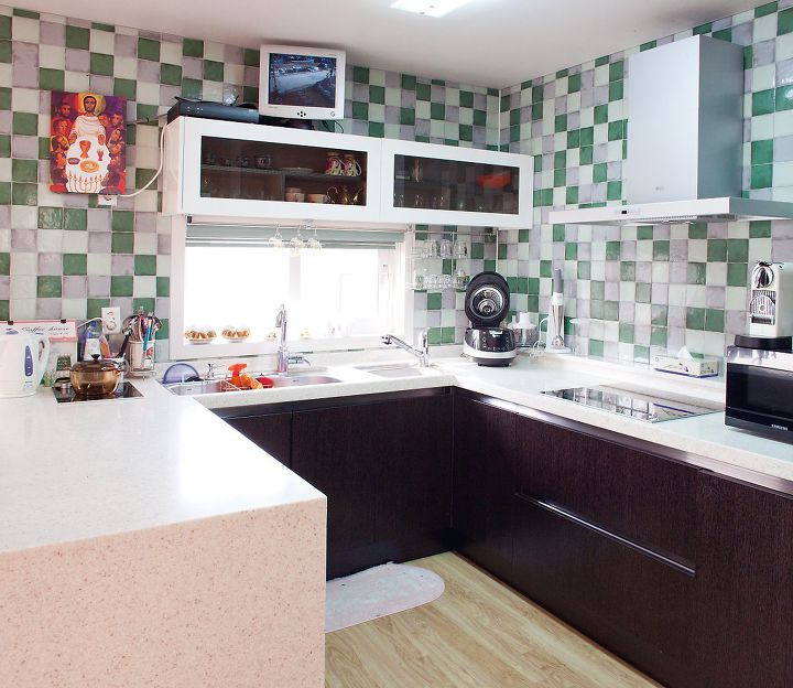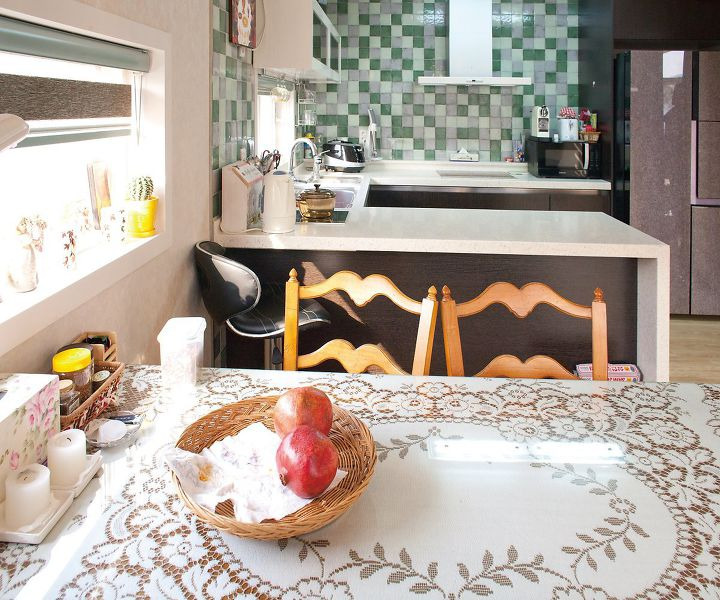 벽면은 모자이크 타일로 싱크와 쿡탑은 ㄷ자형으로 산뜻하고 실용적으로 꾸민 주방.