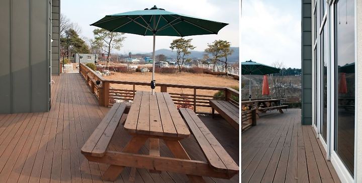 다용도실에서 좌측면과 전면까지 전원에서 요긴한 75.26㎡(22.77평) 데크Deck를 둘러 주택이 훨씬 더 넓어 보이고 안정감이 든다.