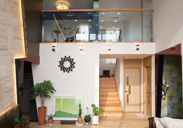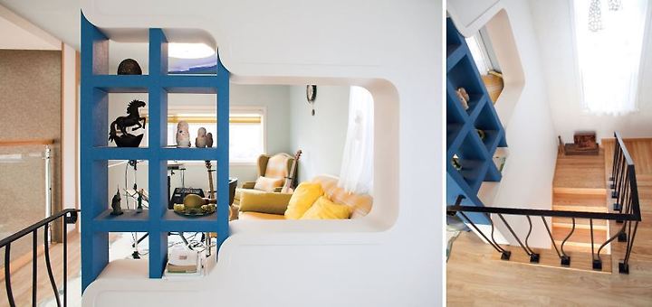 (좌) 곡선과 색채를 이용해 다이나믹하게 디자인한 2층 가족실. (우) 내벽과 창, 조명 등으로 계단실을 넓고 밝게 꾸몄다.