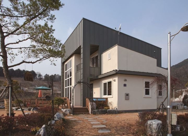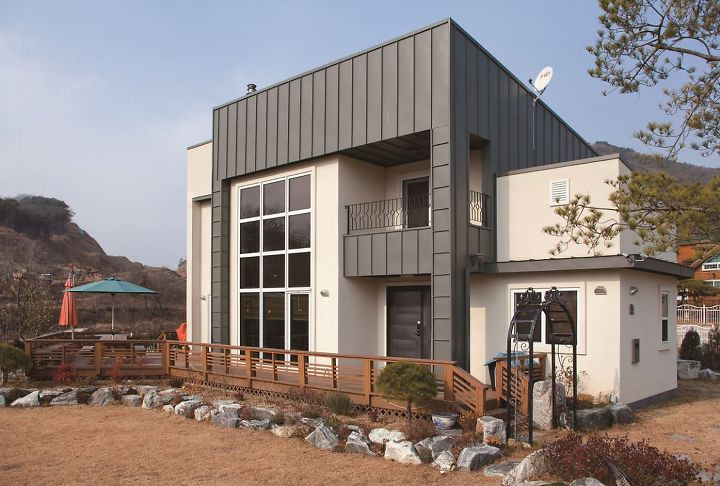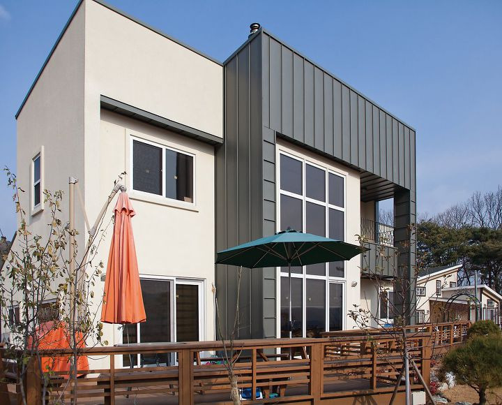 외벽에 흰색 시멘트 사이딩을 두르고 뾰족한 박공지붕에 아스팔트 슁글을 얹은 클래식한 주택(일명 언덕 위의 하얀 집)부터 모듈형 입방체의 조합으로 네모 반듯하게 디자인하고 외벽과 지붕에 징크와 스타코 플렉스를 두른 모던한 주택까지. P씨 주택은 스타코 플렉스를 주조로 하여 징크로 전면 중앙에 배치한 거실과 포치, 테라스의 바깥 테두리를 두르고, 외쪽 경사 지붕에 징크를 얹은 모던 스타일이다.