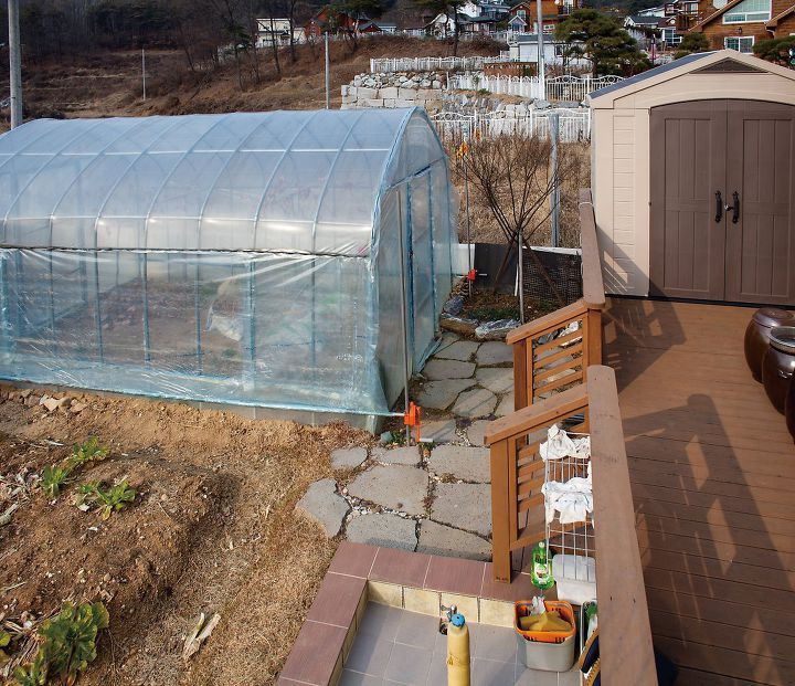 주택 좌측에 텃밭과 비닐하우스, 이동식 창고가 있다.