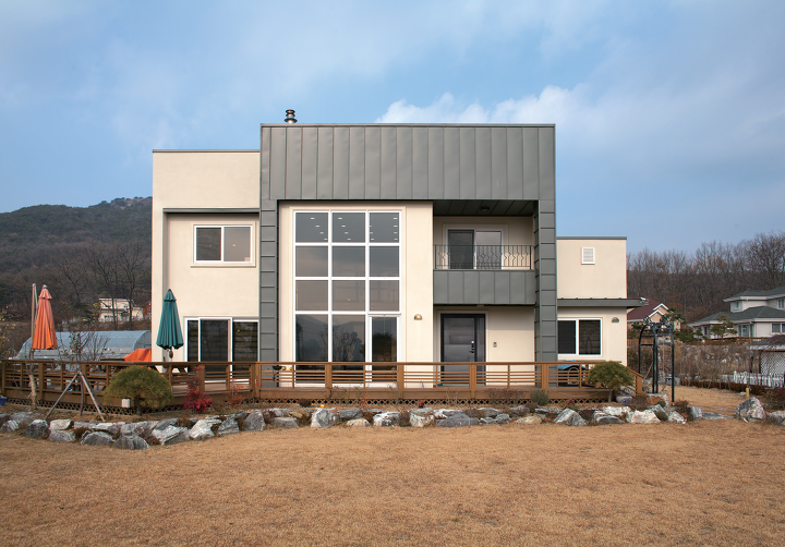 스타코 플렉스를 주조로 하여 징크로 전면 중앙에 배치한 거실과 포치, 테라스의 바깥 테두리를 두르고, 외쪽 경사 지붕에 징크를 얹은 모던 스타일의 주택이 넓은 마당과 잘 어울린다.