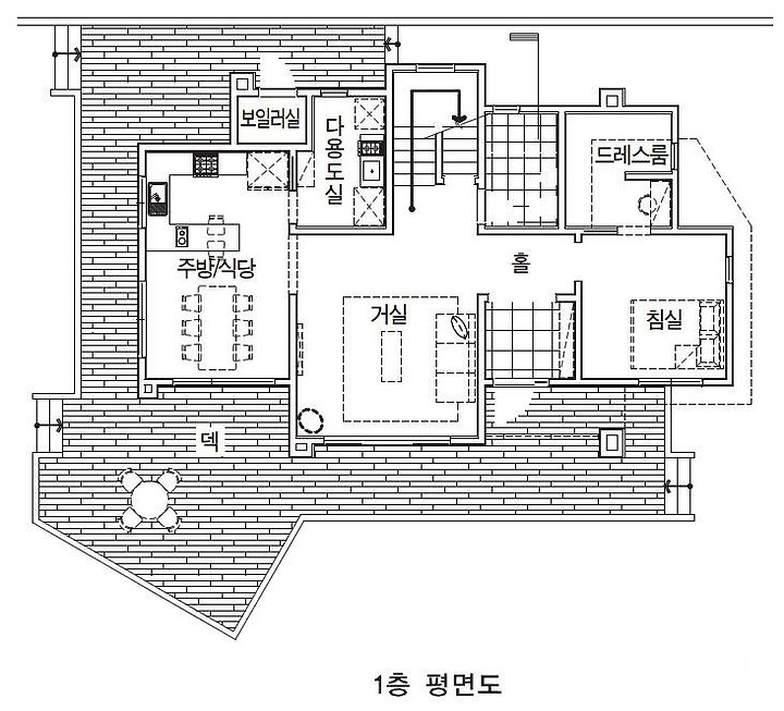 아내 K씨는 “주방/식당을 거실과 별도로 배치한 것은 요즘에는 주방/식당이 본연의 기능뿐만 아니라 차를 마시고 책을 읽고, 또한 여성들이 모여 이야기도 나누는 공간 역할도 겸하므로 작은 거실처럼 사용하기 위해서이다”고 말한다. 주방/식당에서 우측의 포켓도어를 열면 다용도실과 데크, 텃밭, 그리고 다시 주방/식당으로 이어지는 동선이 순환하는 구조이다.