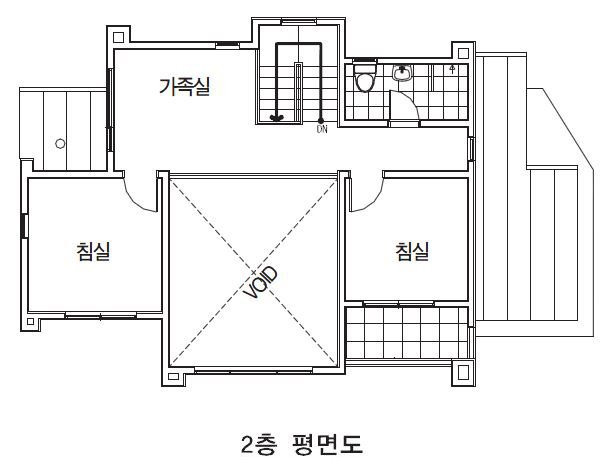 2층은 54.54㎡(16.52평)로 계단실 상부 브리지Bridge형 복도 좌측에는 가족실과 침실이, 우측에는 작은 쉼터인 테라스가 딸린 침실과 욕실이 있다. 인테리어가 1층 거실이 직선과 사선 위주라면, 2층 가족실은 곡선과 색채 중심이다. 2층 복도는 난간을 강화유리로 모던하게 마감해 시선이 아무런 방해를 받지 않고 오픈 천장 구조인 거실 전면 창을 넘나든다. 기타와 음향 시설을 갖춘 가족실이 가족 음악회를 여는 무대라면, 1층 거실은 이를 감상하는 관람석이다.