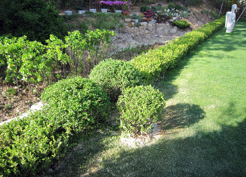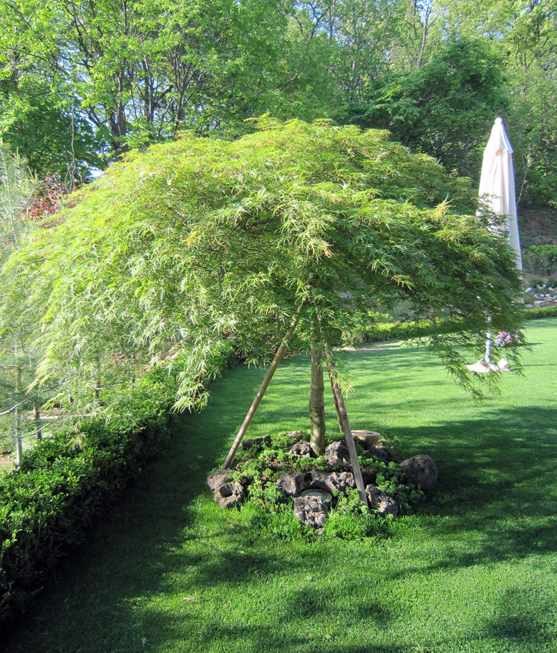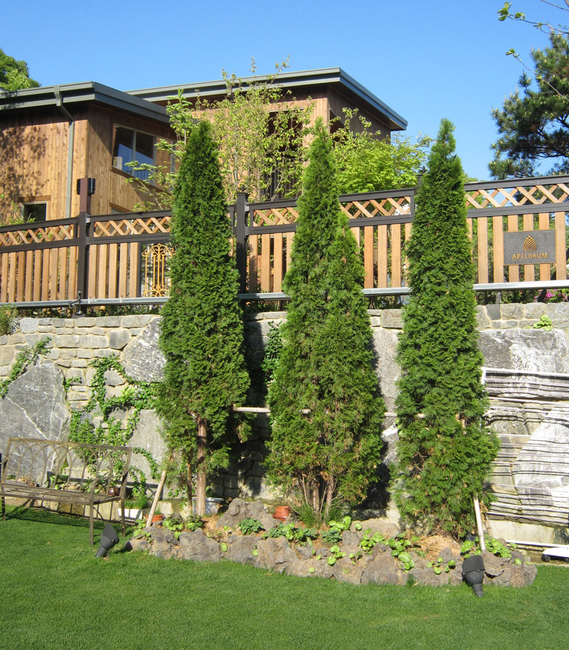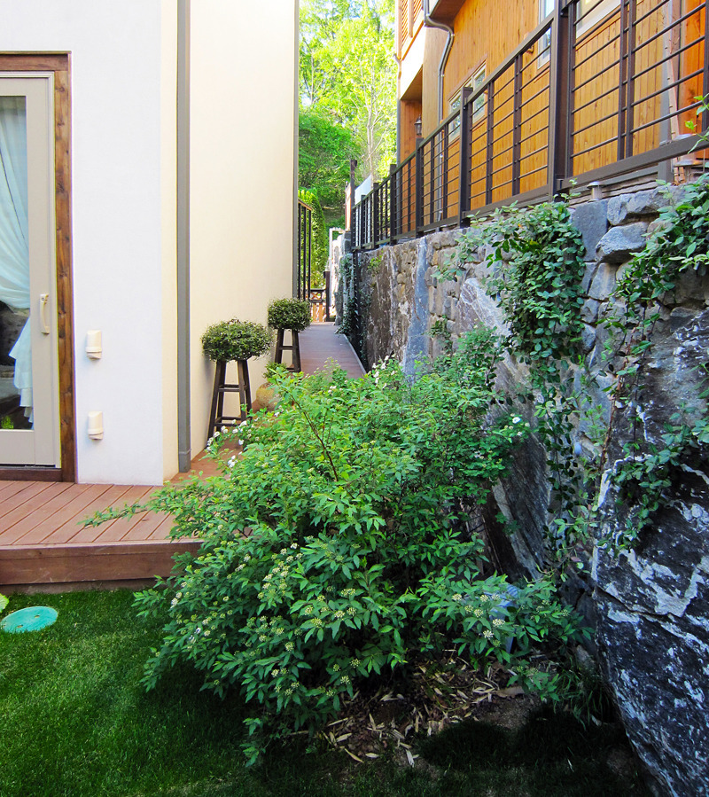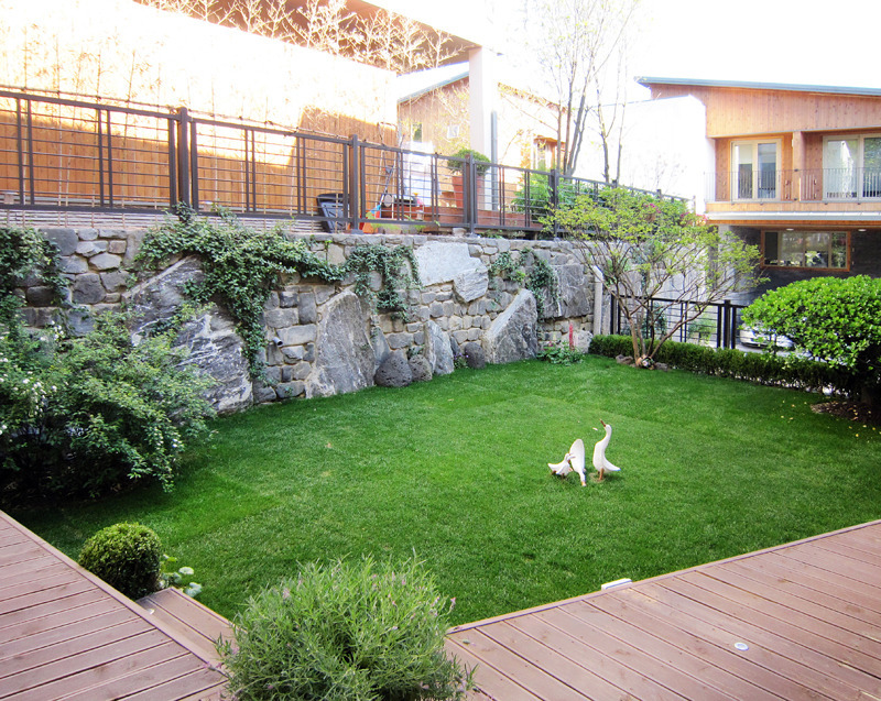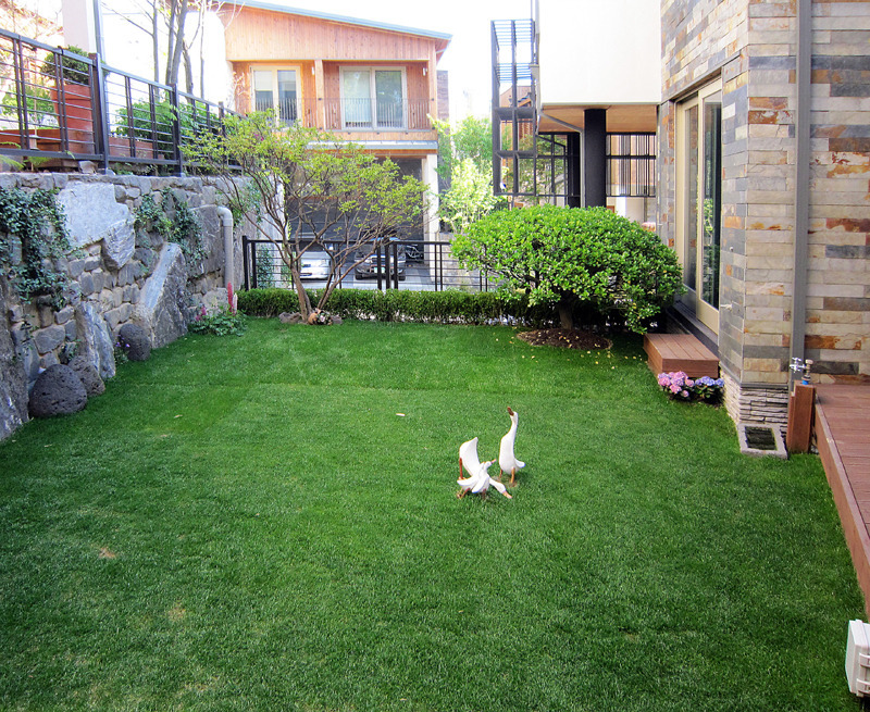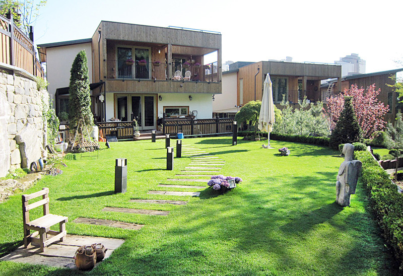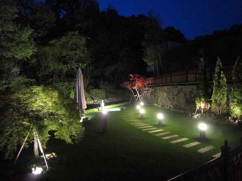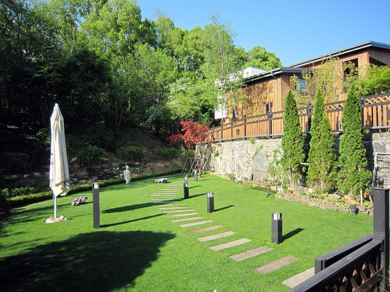 : 데크, 조명, 수목(나무)식재, 양잔디, 스프링클러, 정원용품(야외테이블, 의자, 파라솔, 바베큐, 그릴 등) 디스플레이