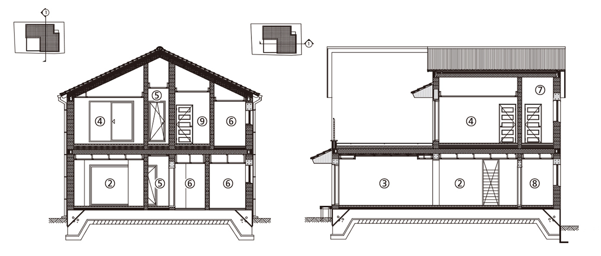SECTION ① 현관 ②주방/식당 ③거실 ④침실 ⑤복도 ⑥욕실 ⑦창고 ⑧다용도실 ⑨드레스룸