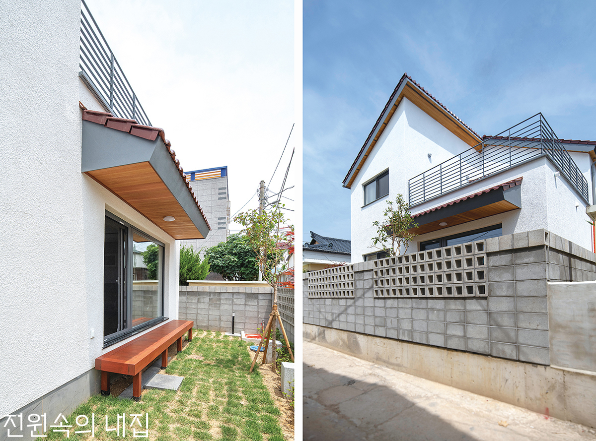 2 - ALC 전용 마감재가 사용된 외벽. 마당 쪽 처마는 별도의 목공사를 통해 만들어졌으며, 벽체와의 결합은 ALC 전용 앵커와 철물을 통해 이뤄졌다. / 3 - 2층 옥상 테라스는 부족한 마당 면적을 보충해 야외활동이 이뤄지는 곳으로 쓰인다.