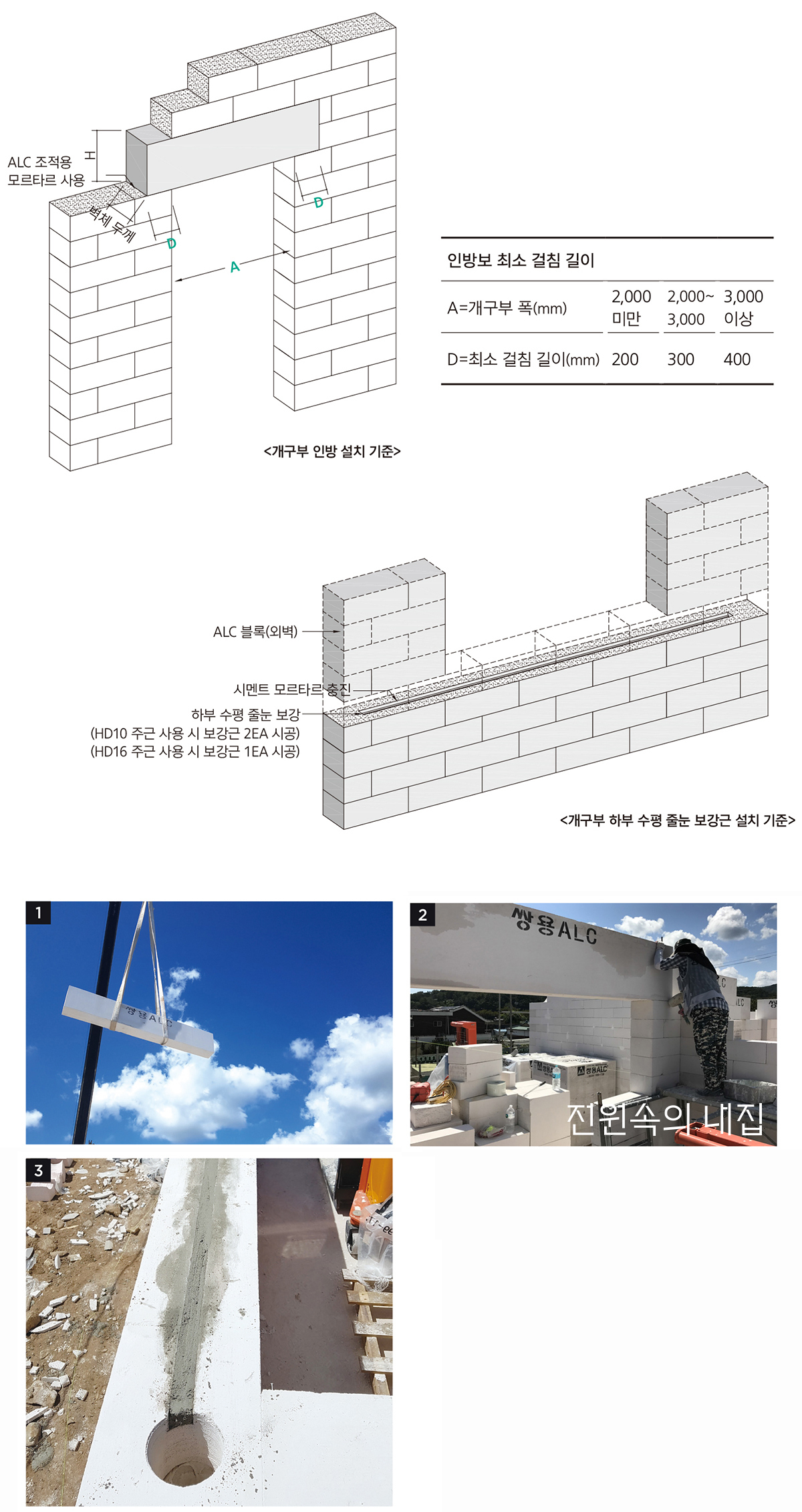 개구부의 상단을 떠받치는 인방보에는 반드시 일반 블록이 아닌 ‘ALC 고강도 내력 인방보’가 적용되어야 한다. 고강도 인방보를 적용하더라도 외벽 모서리에서 수평 거리 1.2m 안에는 개구부 설치를 피해야 하며, 같은 층에 개구부를 여러 개 설치하는 경우에도 개구부 간 수평 거리가 1m 이상이어야 한다.