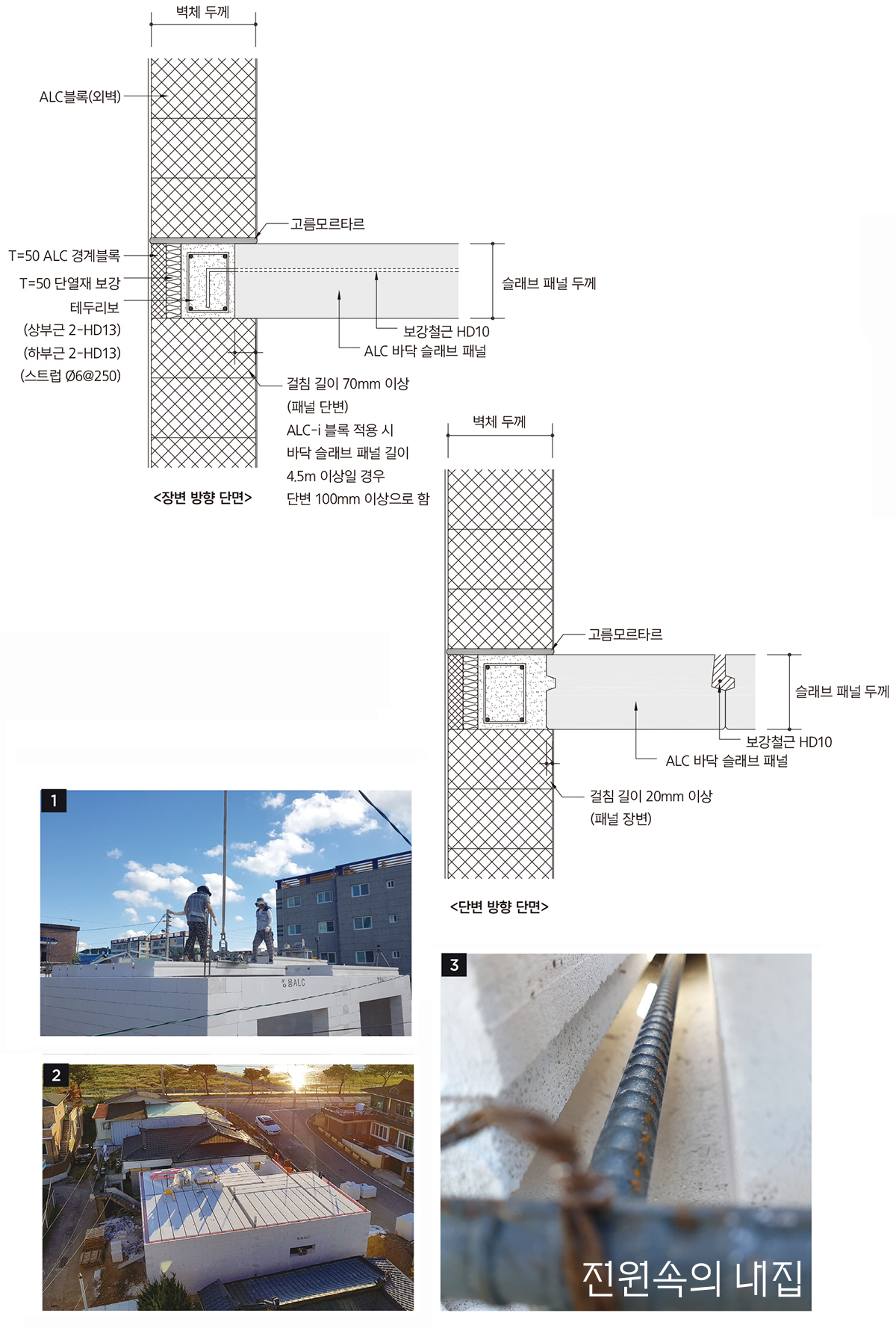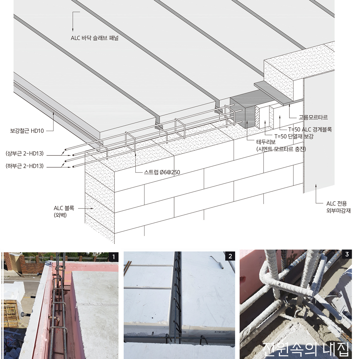 1 - 테두리보는 ALC 경계블록(50T), 단열재(압출법보온판 50T), 테두리보, ALC 슬래브 패널(걸침 길이 부분, 장변 20mm, 단변 70/100mm)로 구성되어 있다. / 2 - 내벽 걸침 부위 위로 테두리보가 배치되어 있다. / 3 - 보강 기둥과 외벽, 내벽 테두리보가 한데 모여 결합된 모습