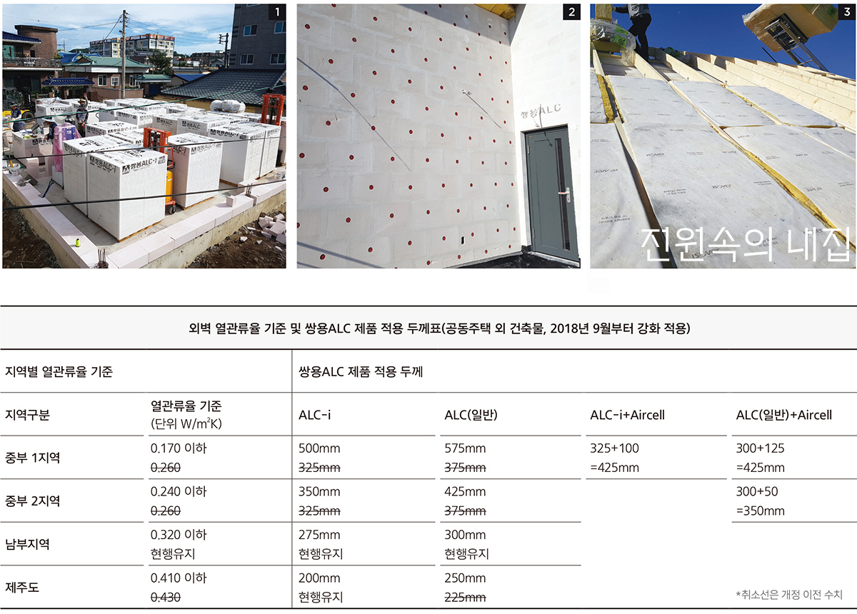 한편, 오는 9월부터 중부지역이 중부 1과 2로 분리되고 열관류율 기준이 높아지는 등 지역 단열 기준이 강화된다. 남부지역과 제주도는 큰 변화가 없어 현 상황으로도 대응할 수 있지만, 중부 1지역은 일반품 ALC를 적용해 높아진 단열 기준을 맞추려면 두께가 575mm, ALC-i도 500mm에 달하게 된다. 이에 따라 기존 블록에 에어셀로 단열을 보강해 대응하고 있다.