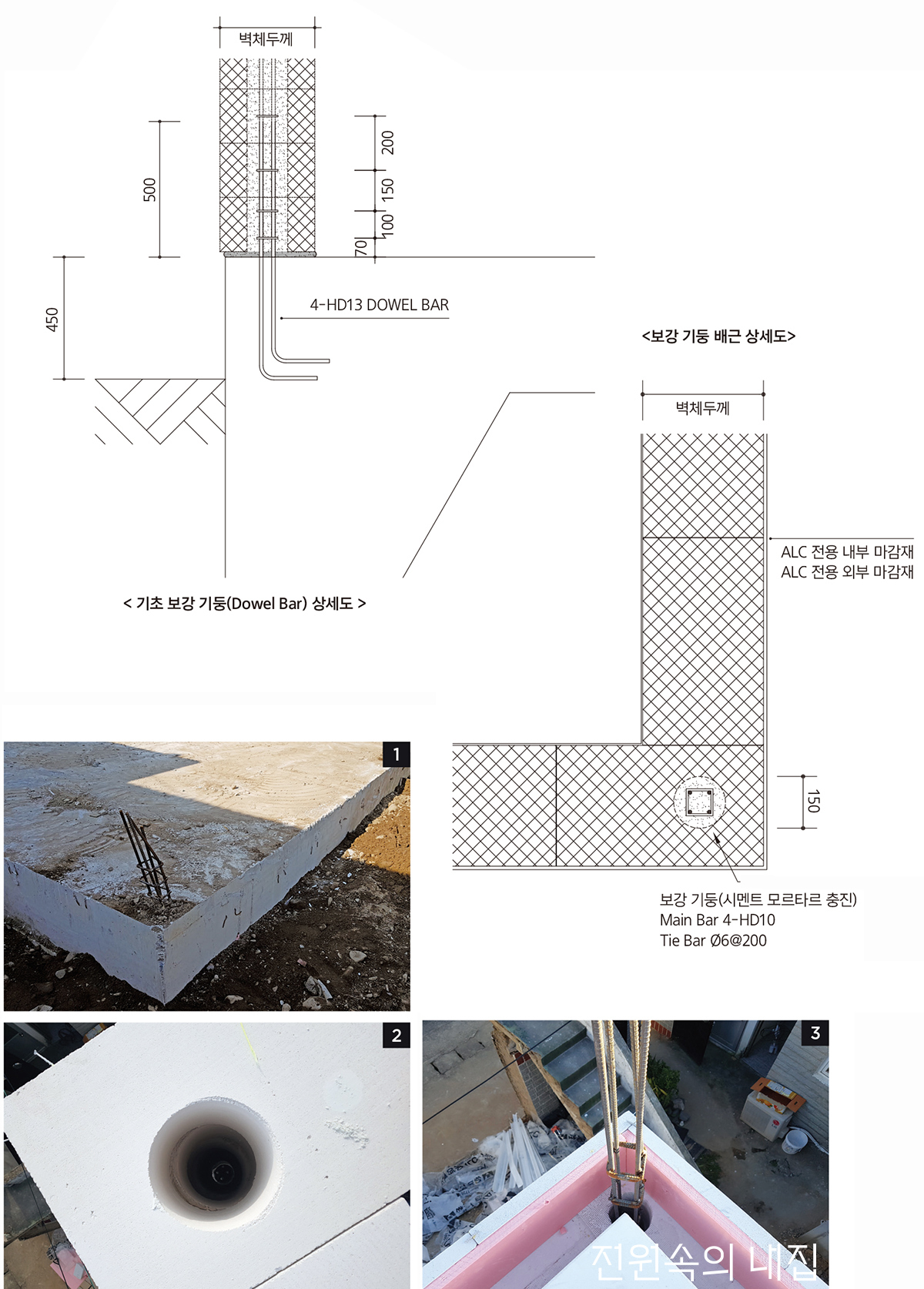 보강 기둥 설치 예정 자리에는 기초를 타설할 때부터 HD13(직경 13mm) 철근 4개를 기초 위로 500mm까지 뽑아놓아 다웰바(Dowel Bar)를 마련한다. 이 다웰바는 기초와 보강 기둥을 결합하는 역할을 하게 된다. 다웰바 자리를 중심으로 직경 150mm짜리 천공을 타공한 ALC 블록을 물려쌓아(막힌 줄눈) 테두리보 높이까지 조적하고 나면, 미리 제작한 보강 철근을 천공 자리에 삽입, 보강 철근이 다웰바에 닿도록 한 다음 모르타르를 충진하고 마무리한다.
