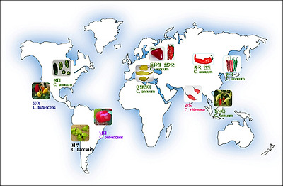 ▲ 세계 각국 고추의 재배분포와 종의 다양성 ~~