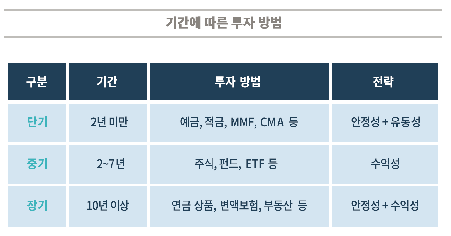 이처럼 기간에 따라 투자 방법도 달라지기 때문에 목표 기간은 반드시 정해둬야 합니다. 기간에 따라 어떠한 금융 상품에 투자해야 하는지는 아래 표에서 간단히 살펴보겠습니다.