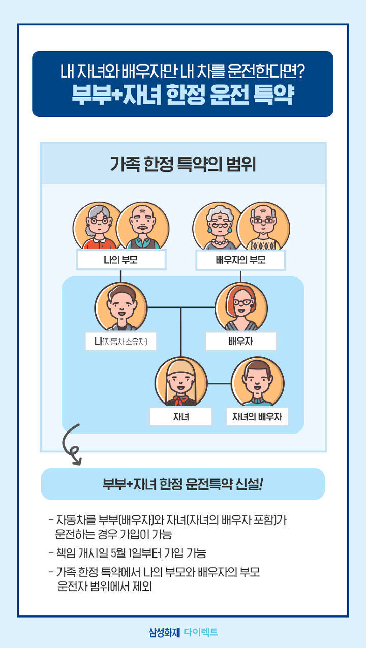 삼성화재 다이렉트에서 5월 1일 부부와 자녀만으로 운전자를 한정한 부부+자녀 한정 운전 특약’을 출시 했습니다.