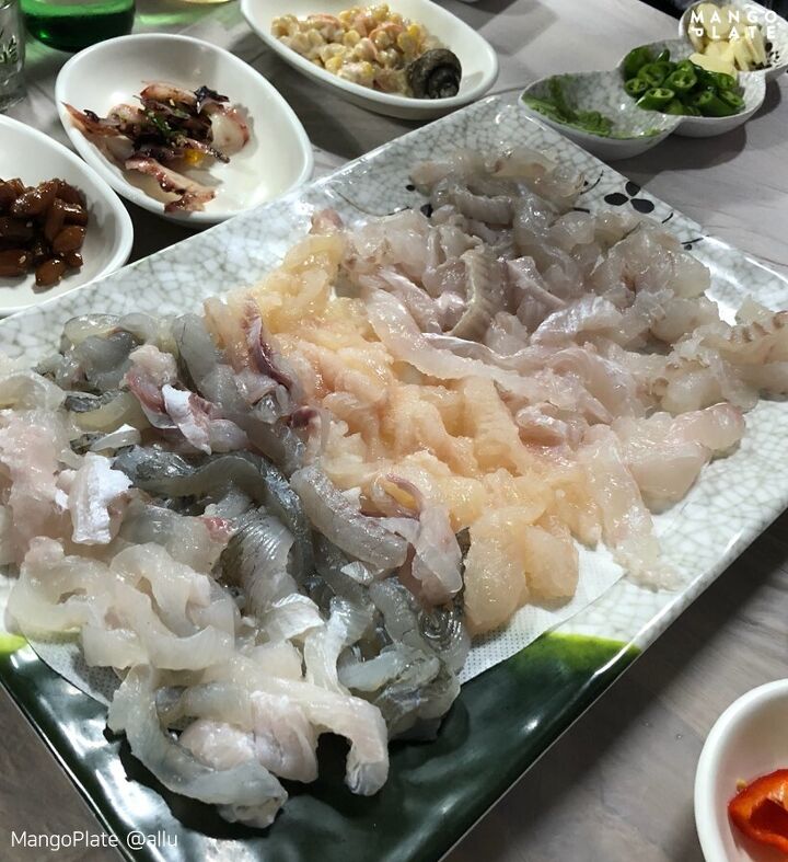2-3인 기준 회+물회 1번 세트, 4인 이상은 회+물회+탕 2번 세트를 추천! 뼈째먹는 막회 스타일로 2-3종류의 생선을 준비해주신답니다. 막장에 회를 찍어먹어도 좋고 쌈을 싸 먹어도 좋아요. 쫄깃하고 쫀득한 식감으로 신선도가 딱 느껴질 거예요. 매운탕은 약간은 자극적이면서 간간한 편이라 누구나 좋아한다고.