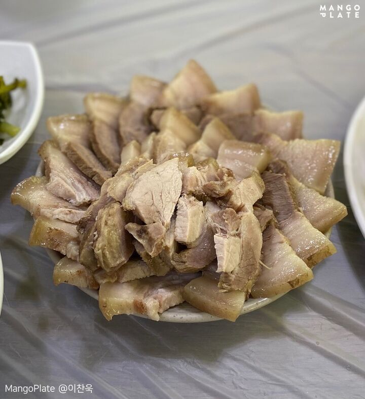 메밀국수는 면과 동치미 국물 따로따로 내어주시는데 취향에 맞게 비빔으로 먹을 수도, 동치미 국물을 끼얹어 물막국수로 즐길 수 있어요. 동치미 국물 한 입만 맛보아도 '아! 여기가 찐 맛집이 구나' 하실 거예요. 겨자랑 들기름을 넣는 것도 별미!(수육에 가까운) 편육을 명태식해에 곁들여 몇 점 먹다가 메밀국수면+편육+명태식해 삼합으로 즐기는 게 팁! 편육 전문점이라고 해도 믿을 정도로, 동치미 맛의 메밀국수가 안 맞는 분들도 이 메뉴는 인정할 정도라고 해요. 새우젓보다는 새콤 달달한 양념의 명태식해의 조합을 추천합니다.