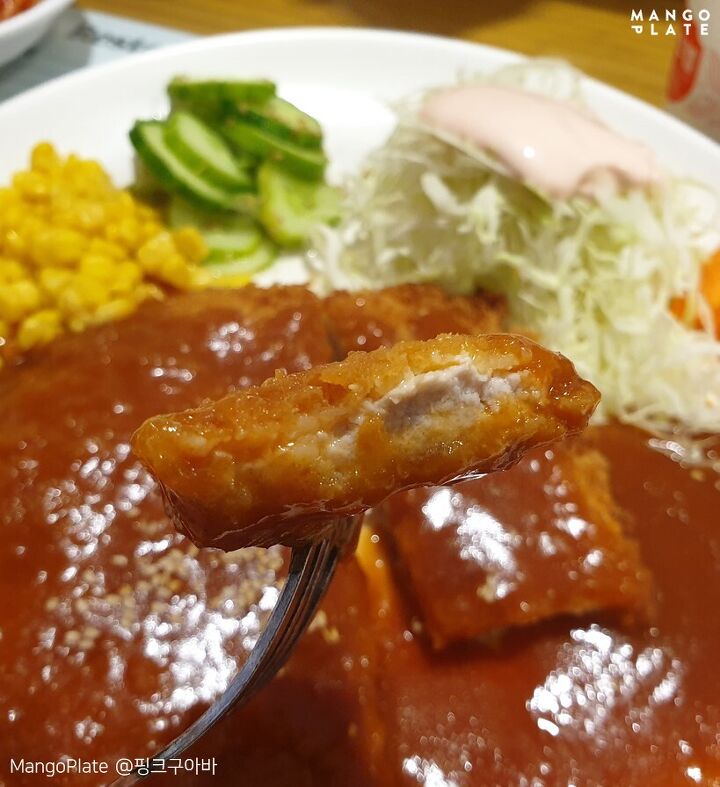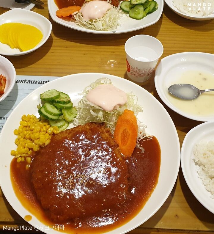 이름부터가 옛날 돈가스 경양식 느낌이 확 들지 않나요? 메뉴도 돈가스 단 한 가지! 큼지막한 이 돈가스는 두께가 얇은 편이고 옛날 돈가스답게 달달한 소스가 이미 부어진 채로 나온답니다. 옥수수와 양배추 샐러드, 오이무침이 사이드로 부드러운 크림수프와 함께 제공되는데요.