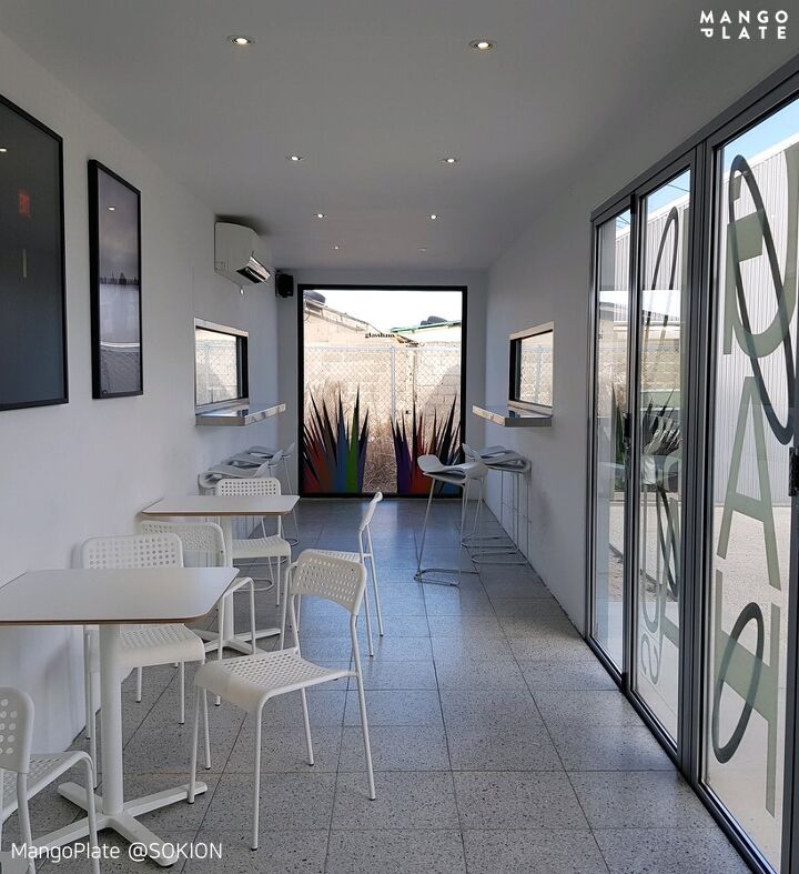 글라스하우스는 서퍼들이 큰 파도를 뚫고 나올 때 그 속이 유리 집 같아 만들어진 서핑 용어라고 해요. 서핑을 좋아하는 사장님께서 만드신 공간임이 딱 느껴지는 이름이죠! 가운데에 중정 같은 야외 공간이 있고 그 주위로 4개의 작은 건물이 있어요. 서핑 용품을 판매하는 샵과 카페로 공간이 나뉘어 있답니다.