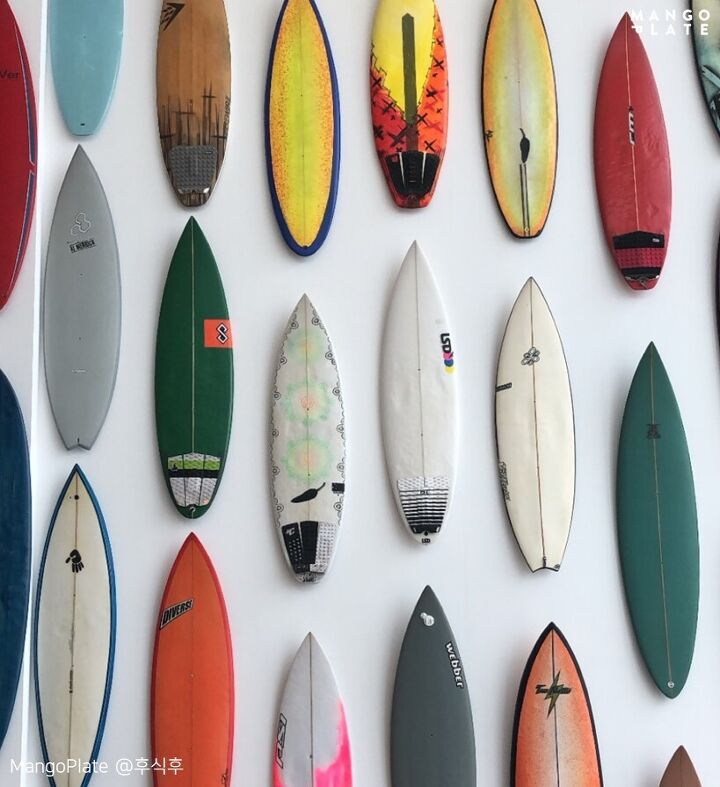 층별 인테리어 느낌이 조금씩 달라 보는 재미가 있어요. 그중에서도 이렇게 서핑보드를 벽면에 붙인 이 공간은 누가 뭐래도 포토스폿! 오픈 시간에 맞춰가면 손님 없이 나 홀로 이 공간을 독차지할 수 있어요. 인생 샷은 덤! 이렇게 바다를 바라보는 방향으로 계단식의 좌석들이 쫙 깔려있는데요. 그냥 앉아 있는 것만으로도 힐링이 돼요.