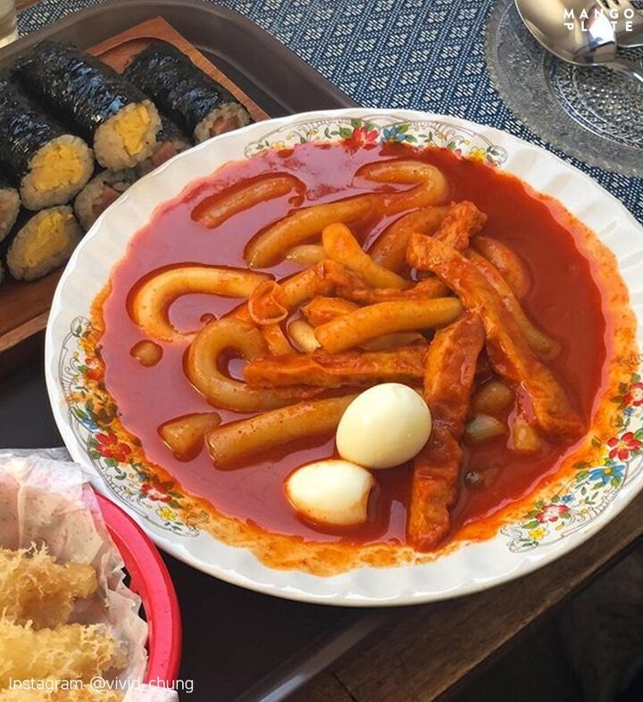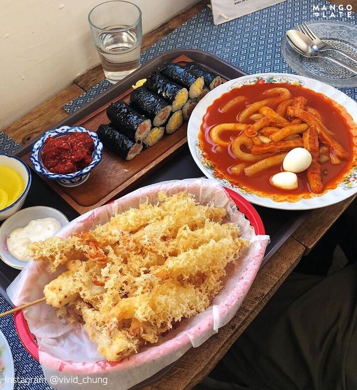 대표 메뉴는 떡볶이, 튀김, 김밥입니다. 세 가지 메뉴를 모두 시켜서 맛보는 걸 추천해요. 떡볶이는 맵지 않고 달달한 편. 가늘고 긴 떡이라 소스가 잘 배 있어요. 가위로 잘라먹는 재미도 있답니다.