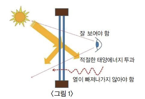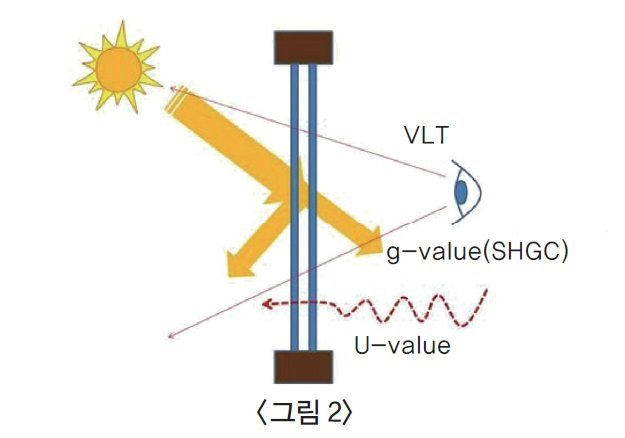 위 그림은 한국패시브건축협회에서 유리의 특성을 설명한 것이다. <그림 1>은 사람이 유리를 사용하면서 요구하는 성질을, <그림 2>는 그 특성을 설명하는 값을 나타낸 것이다.