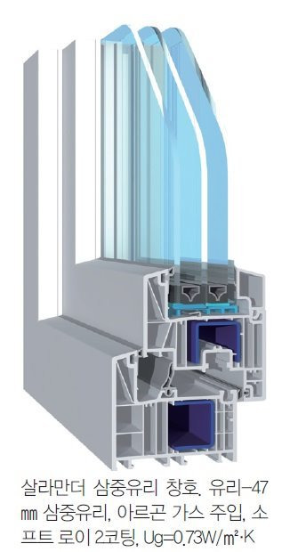 한국패시브건축협회는 “1.5ℓ 패시브하우스 건축을 위해선 고성능 삼중유리 시스템창호를 적용해야 한다”고 밝히고 있다. “아르곤, 크립톤 가스를 충전한 로이 Low-Emissivity 코팅 유리를 사용하고 유리 및 프레임은 열 관류율이 0.80W/㎡· K 이하며, 기밀성 0.0㎥/㎡ h인 창호를 써야 사용 면적당 연간 에너지 요구량이 1.5ℓ에 불과한 패시브하우스를 실현할 수 있다”는 것이다.