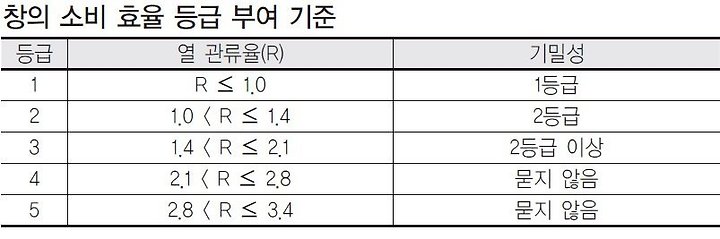 우리나라는 창호의 제조·수입업체들이 생산 및 수입 단계에서부터 원천적으로 에너지 절약형 제품을 생산·판매하도록 하기 위한 ‘에너지소비 효율등급제도’를 운영하고 있다. 창호의 단열 성능과 기밀 성능에 따라 1~5등급으로 구분해 에너지소비 효율등급 라벨을 표시하며, 등급이 낮을수록 열 관류율이 낮고 기밀 성능이 우수함을 뜻한다. 창호의 에너지소비 효율등급제도는 KS F 3117 규정에 의해 건축물 중 외기와 접하는 곳에 사용되면서 창 면적이 1㎡ 이상이고 프레임과 유리가 결합돼 판매되는 창 세트에 적용되며, KS F 2278 규정에 의해 측정한 열 관류율과 KS F 2292에 의한 기밀성을 기준으로 한다.