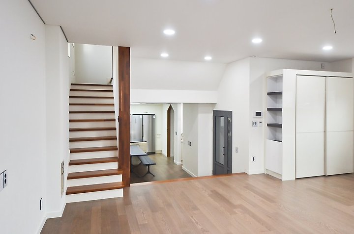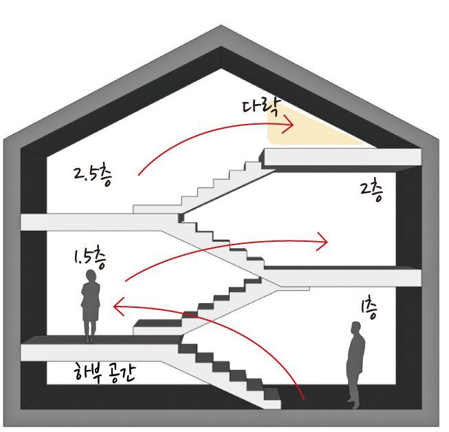 주택을 계획할 때 먼저 몇 층으로 구성할지 고민한다. 보통 층수는 계단을 완전하게 다 올라가면 2층, 또 한 계단을 올라가면 3층, 이렇게 인지하는 게 보통이다. 그런데 주택을 앉힐 대지가 경사면인데 옹벽을 세워 레벨을 높이는 게 싫다면, 또는 경사면을 활용해 자연스럽게 건물을 올리고 싶다면 어떻게 해야 할까. 이처럼 조금 다른 공간 형태를 원할 경우 적용하는 방법 가운데 하나가 스킵플로어다. 이는 계단을 올라갈 때 한 번 꺾이는 부분마다 방이나 거실 등 실을 배치하는 방식이다. 계단참 또는 반 층마다 공간과 공간을 연결하는 방식으로 1층과 2층 사이에 1.5층을 두는 것이다. 스킵플로어는 건축법상 따로 정해진 방식이 아니다. 스킵플로어 형태로 2.5층과 같이 건축하면 3층으로 볼 수도 있다. 그래서 층수 제한이 있는 택지지구라면, 해당 지자체와 설계 단계에서 자세히 협의한 뒤 진행하는 게 좋다.