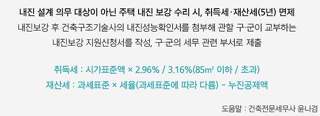 내진 설계 의무 대상이 아닐 때 지은 주택의 경우, 내진성능 평가를 받은 확인서를 가지고 내진보강 지원 신청서를 작성해 각 지자체에 내면 신축/보수공사에 따라 취득세와 재산세 감면 혜택을 볼 수 있다.