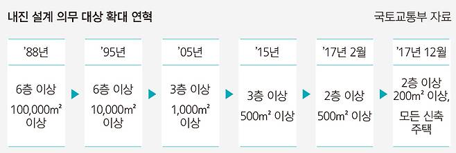 경주 지진 발생 후인 2016년 12월, 정부가 내놓은 ‘지진방재 종합대책’에서는 내진 설계 의무대상을 2층 이상의 신축 건물(200㎡ 이상) 및 모든 주택으로 확대했다. 이는 2017년 5월에 공식 발표되었고, 지난 12월 1일부터 시행되었다(건축법 시행령 32조 2항).