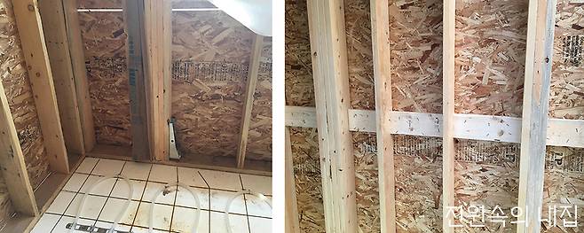 A3 / 기초와 1층 벽체 하단이 연결되는 부분, 층과 층이 연결되는 부분이 제대로 시공되어 있지 않을 경우 상대적으로 취약할 수밖에 없다. 부재간의 결속력 강화를 위해 반드시 검증된 목구조용 철물 사용과 부재 간 못박기에 신경 써야 한다. 특히, 수평 하중에 대한 벽체의 전단력을 감당하는 벽덮개(OSB 또는 구조용 합판 등)의 못박기가 중요하다. 건물의 변형 방지를 위한 전단벽 고려와 함께 슬라이딩 방지를 위한 앵커볼트, 전도 방지를 위한 홀다운 철물 등이 적용돼야 한다.