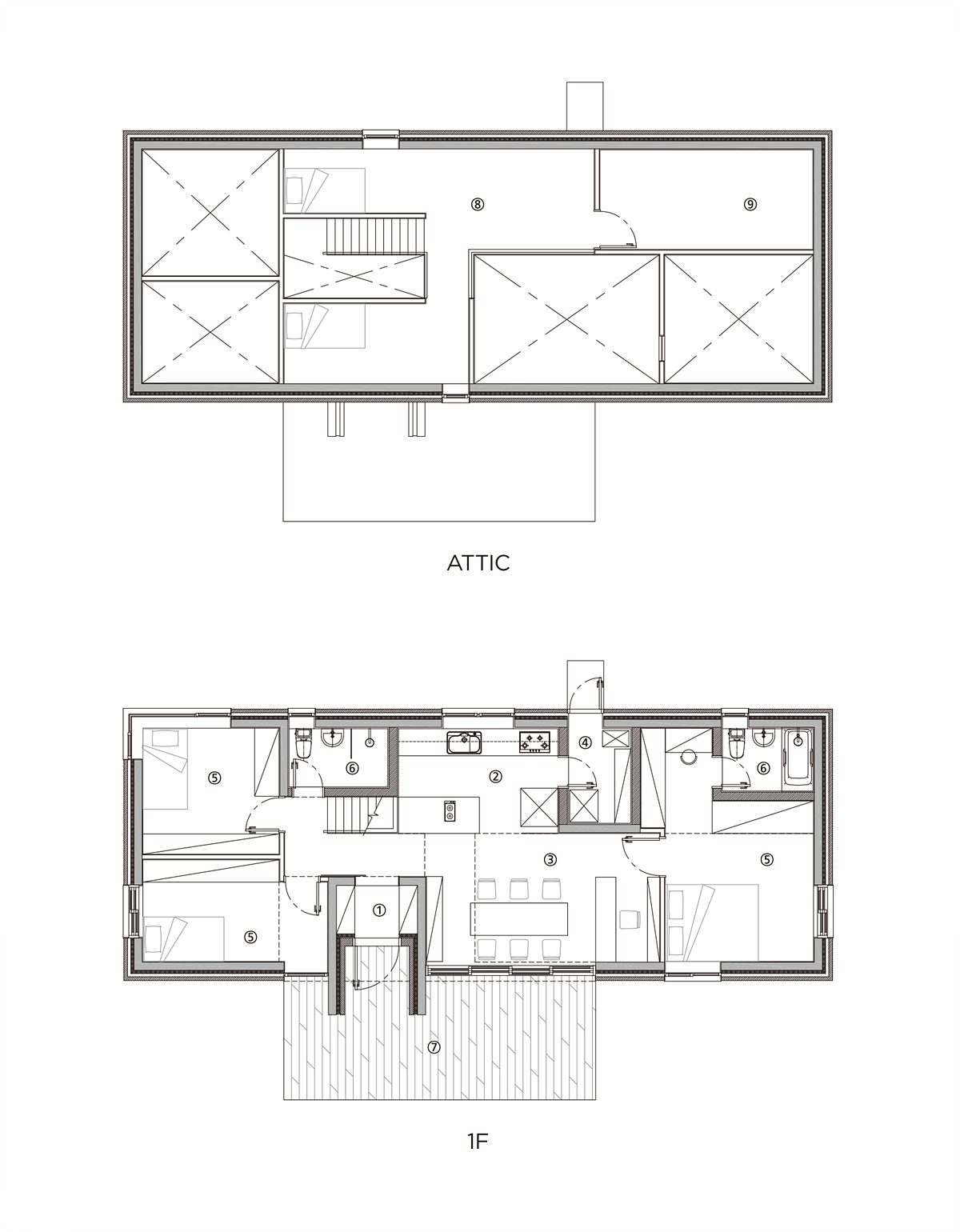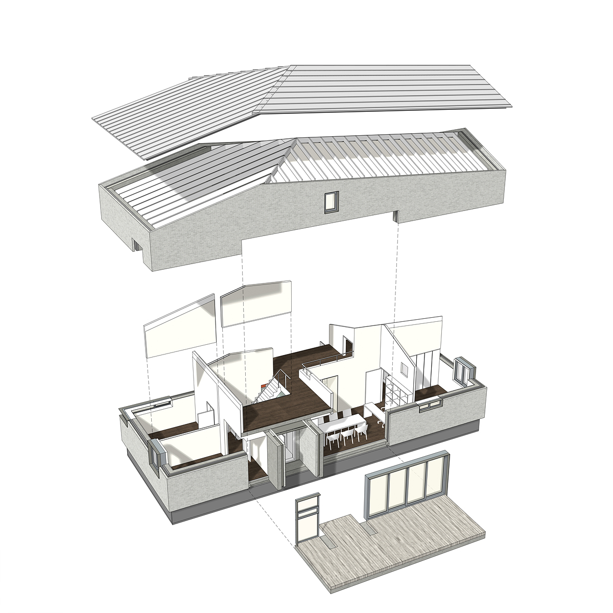 이 집은 지상 1층과 다락, 박공지붕으로 구성된 장방형의 주택이다. 공용공간인 현관, 거실, 주방, 욕실이 집의 중앙에 배치되어 있고 3개의 방은 양 끝으로 퍼져 있다. 다락이 공용부와 소통하는 한편, 각 방은 지붕까지 트인 높은 층고를 갖는다.