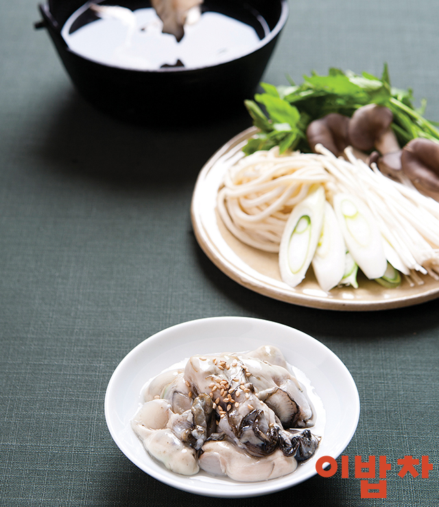 굴샤브샤브, 생소하신가요? 신선한 굴이 나올 때만 맛볼 수 있는 특별한 굴요리랍니다. 끓는 육수에 굴을 살짝 익혀 와사비간장에 찍어 먹으면 맛이 기가 막혀요. 굴의 맛과 향이 우러난 시원한 국물에 칼국수를 끓여 마무리하면 배가 불러도 한없이 들어간답니다.