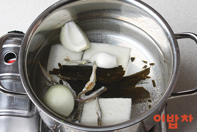 국물용 멸치(10마리), 다시마(1장=10X10cm), 무(2토막=300g), 양파(1개)