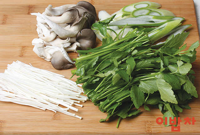 미나리(1줌), 팽이버섯(2줌), 느타리버섯(1줌)