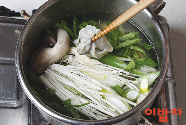 5. 끓는 육수에 채소와 생굴을 살짝 익혀 와사비간장에 찍어 먹고,