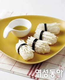 5 팽이버섯을 밥에 올려 김으로 묶는다.